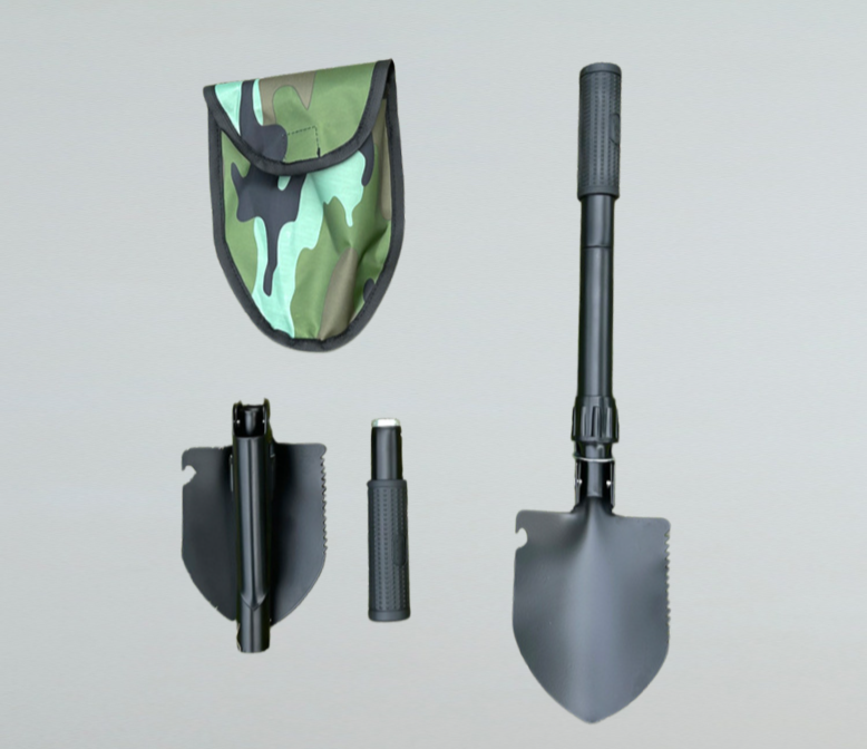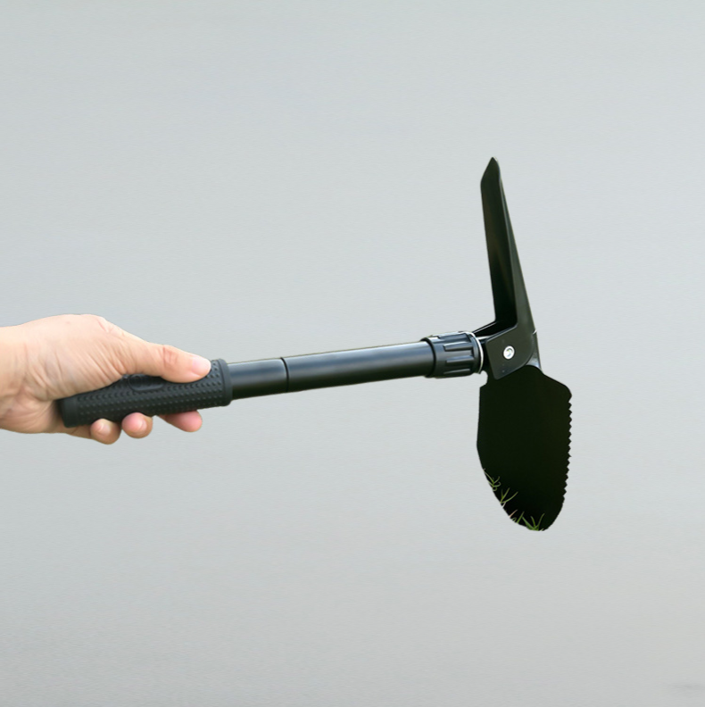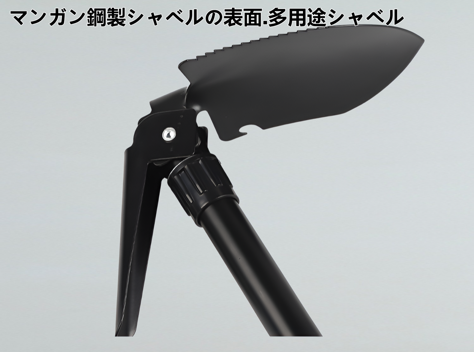 多機能コンパス付きエンジニアシャベル。折りたたみ式で携帯便利、緊急時やアウトドアに最適。つるはし・鍬にも対応。